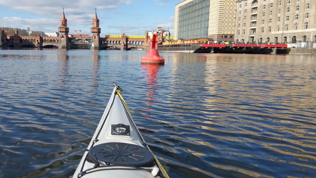 Endlich. Trotz der Tendenz zu Tauwetter hat mir nach den frostigen Nächten der letzten Tage ein wenig die Zuversicht gefehlt. Daher ging es mit der Familie zunächst zu Fuß zur Einstiegsstelle, die auch vom Eis befreit werden wollte. Spreeaufwärts sah es morgens noch nach mehr Eis aus. Also ging es mit dem Kajak zunächst spreeab. Wenn nichts anderes geht, wollte ich eben ein paar Mal zwischen Insel der Jugend und Oberbaumbrücke hin und her fahren. Bis ich aber zurück an der Einstiegstelle war, hatte ich gemerkt, dass man dem Eis beim Tauen zuschauen kann. Also bin ich spreeauf und hatte freie Fahrt bis Köpenick. Auch die Durchfahrt Richtung Müggelsee, an der ich in der Vergangenheit eisbedingt nicht durchkam, schien frei. Das zu testen, gaben die müden Gelenke nach der längeren Zwangspause allerdings nicht her. Zufrieden war ich dennoch – und zwar sehr.